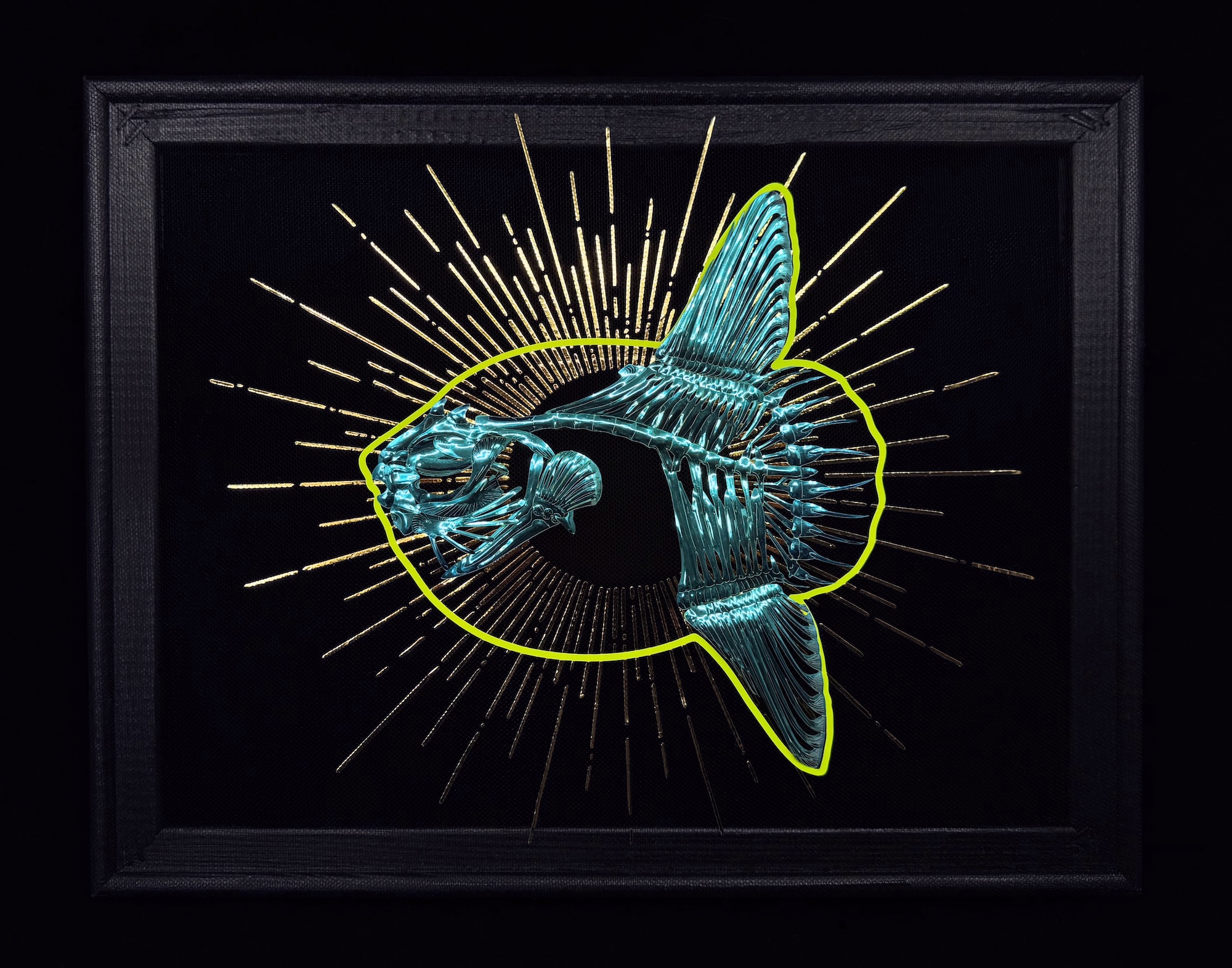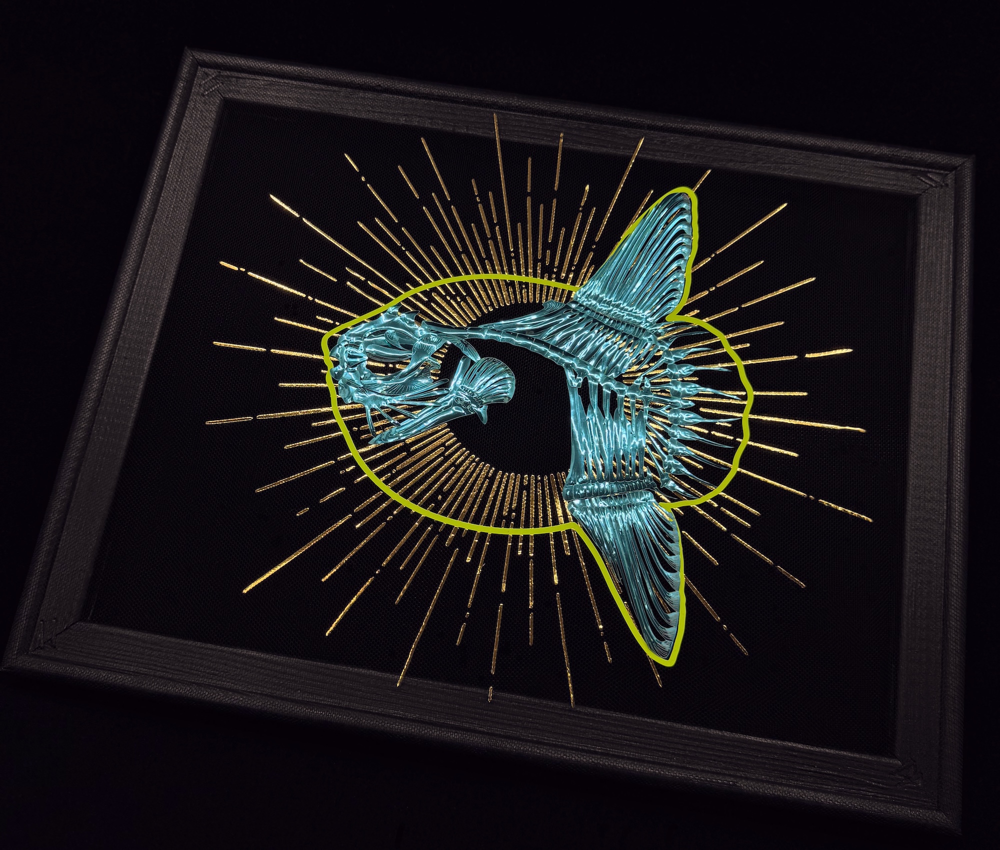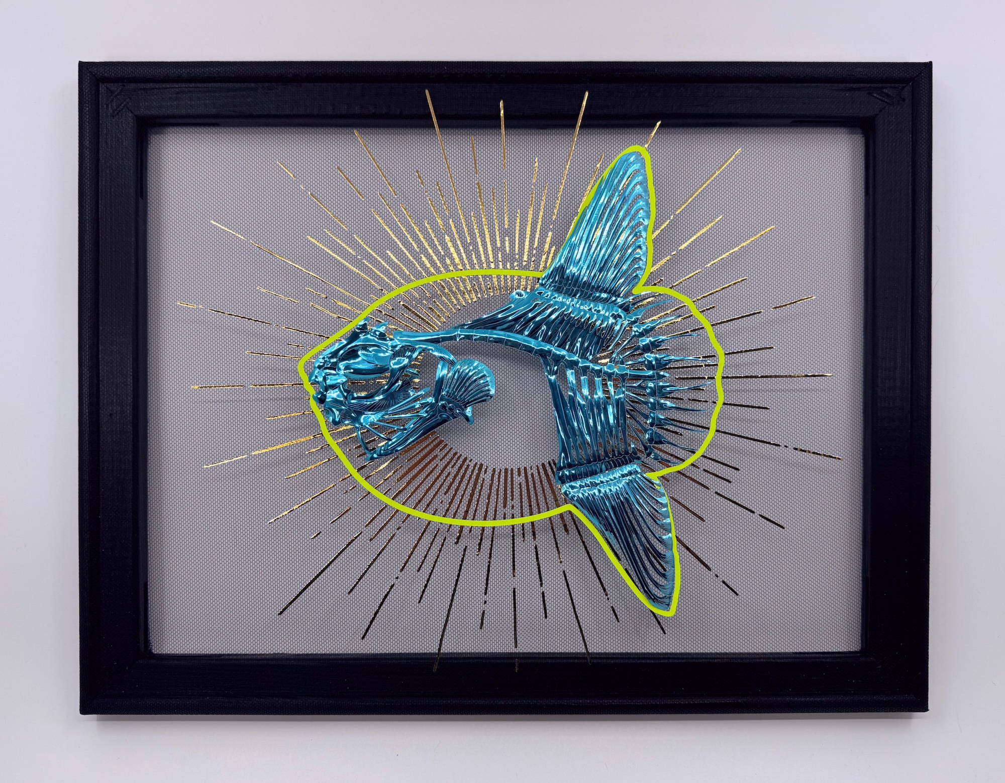 Sequin film, hand-painted acetate, yupo, thread, glass beads, illusion, pine frame