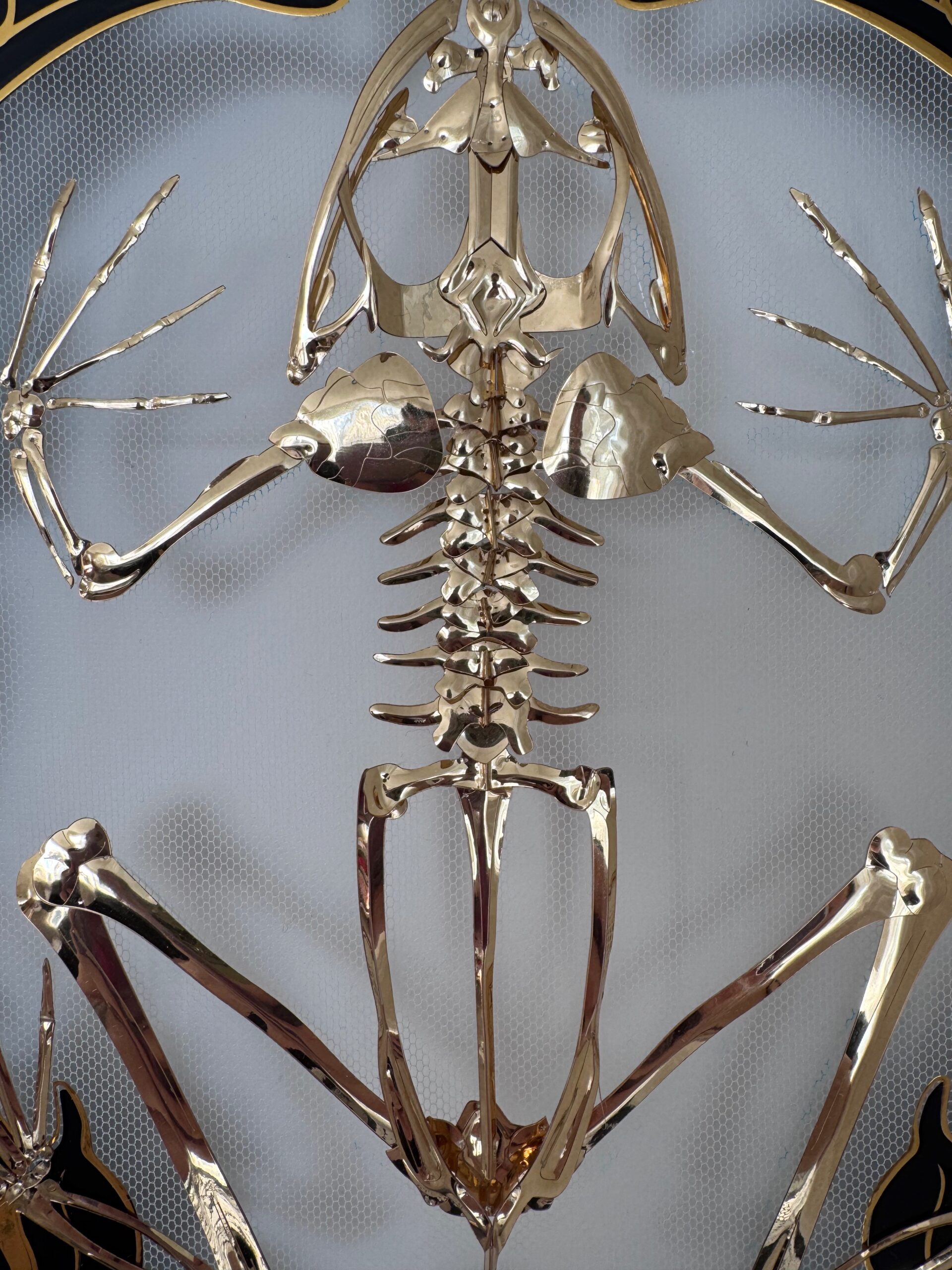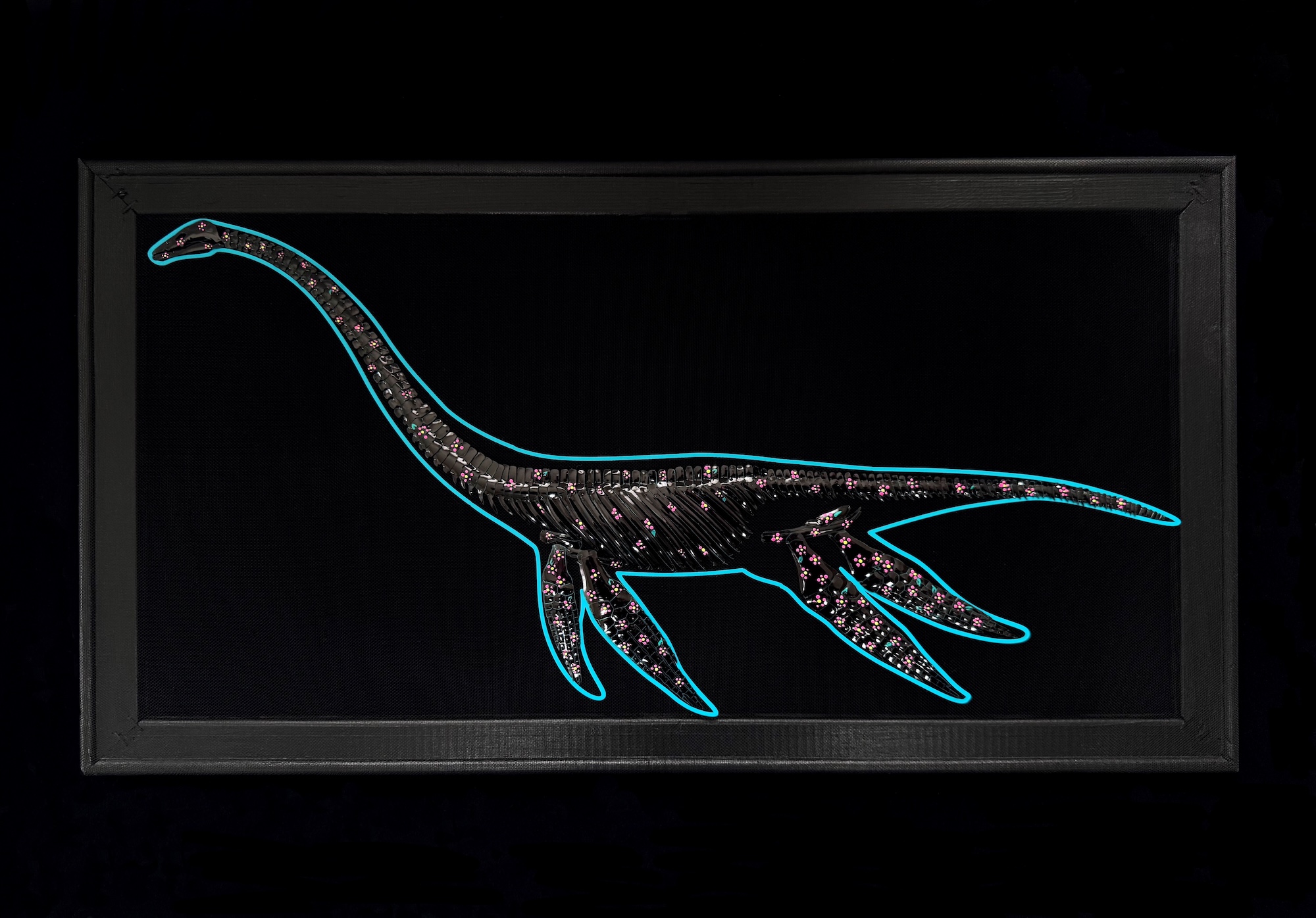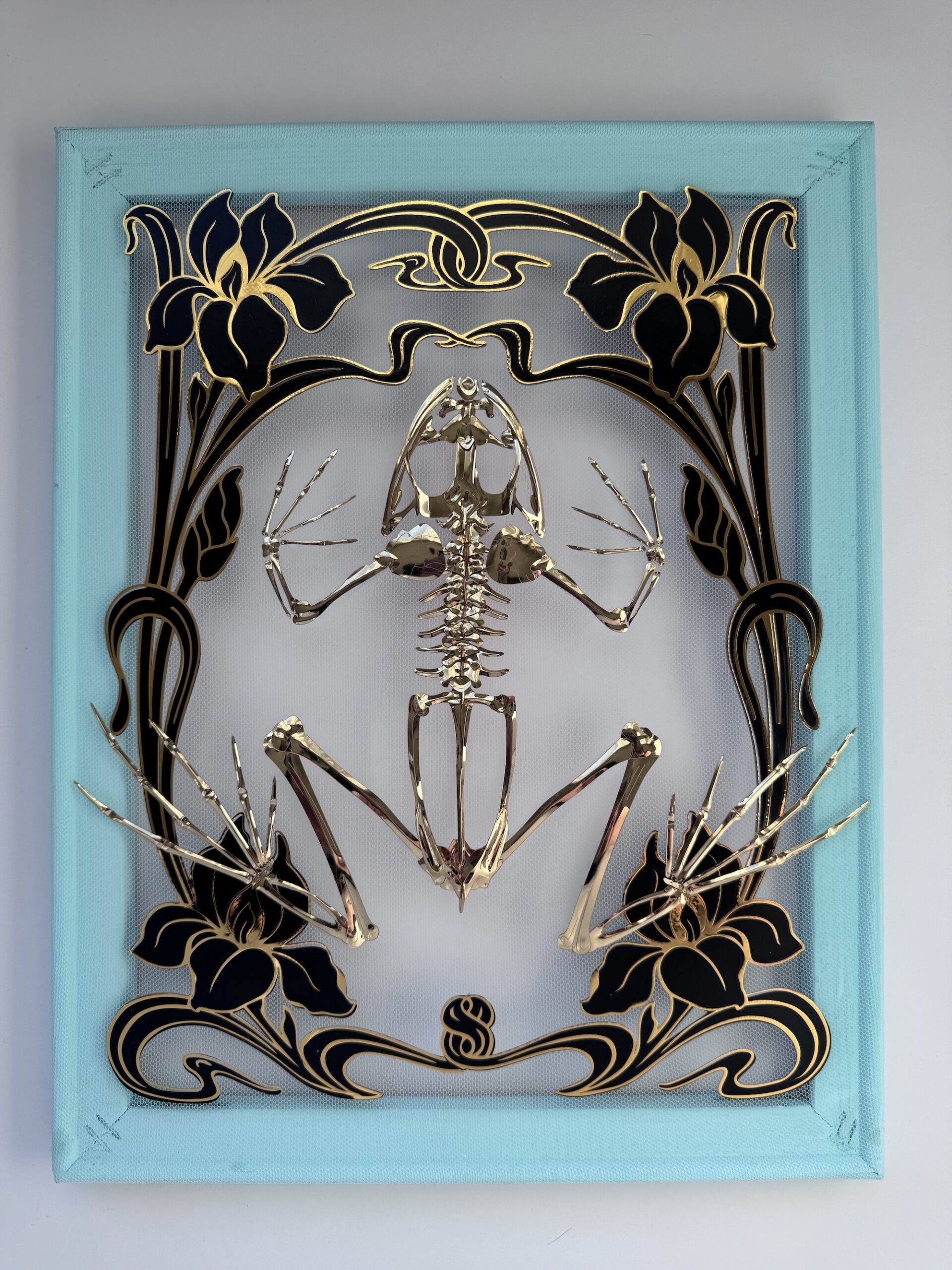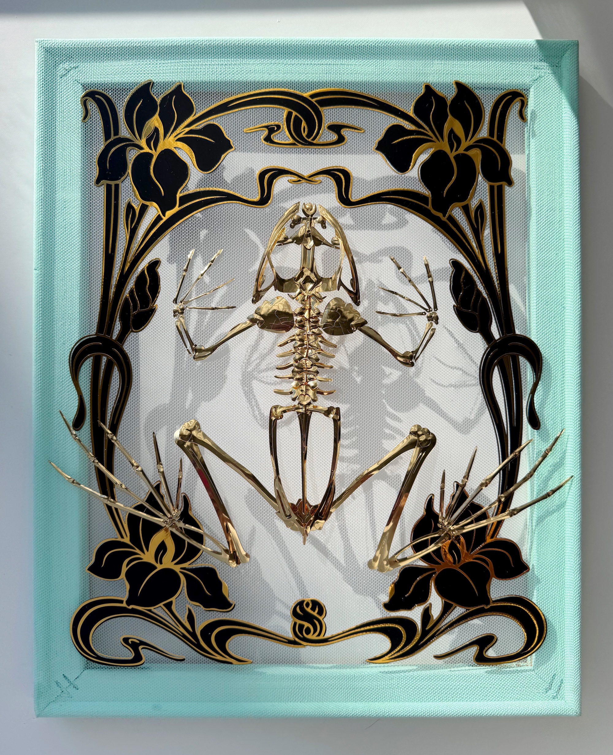 Sequin film, hand-painted acetate, yupo, thread, glass beads, illusion, pine frame