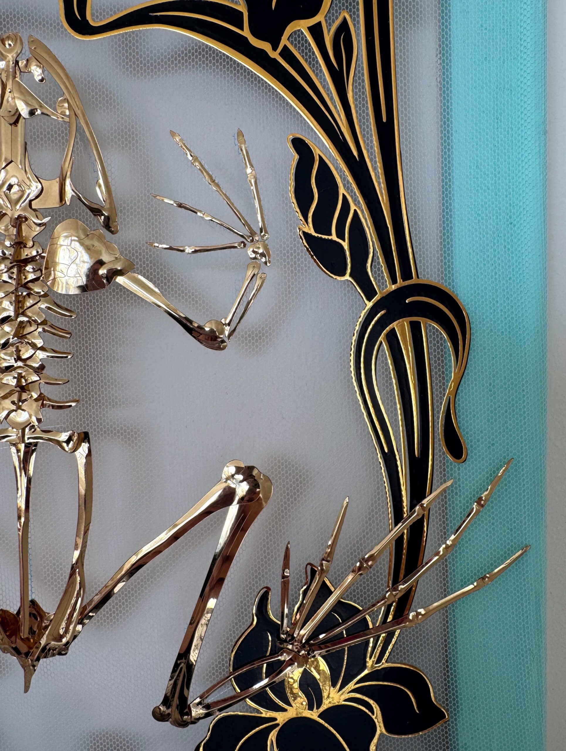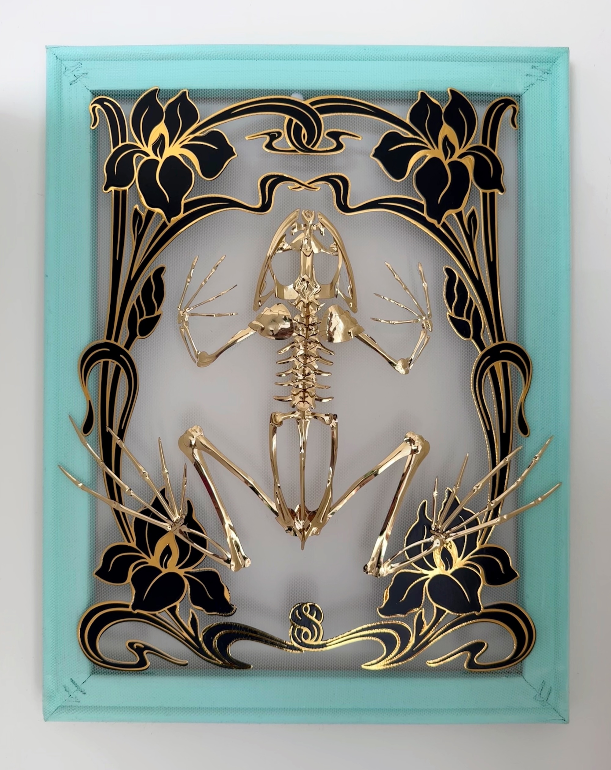 Hand-hammered filigree sequin film, yupo, thread, illusion, pine frame with oak detail