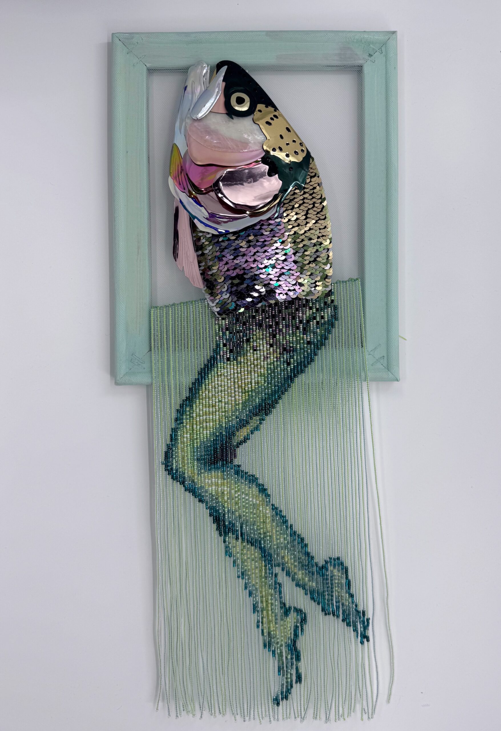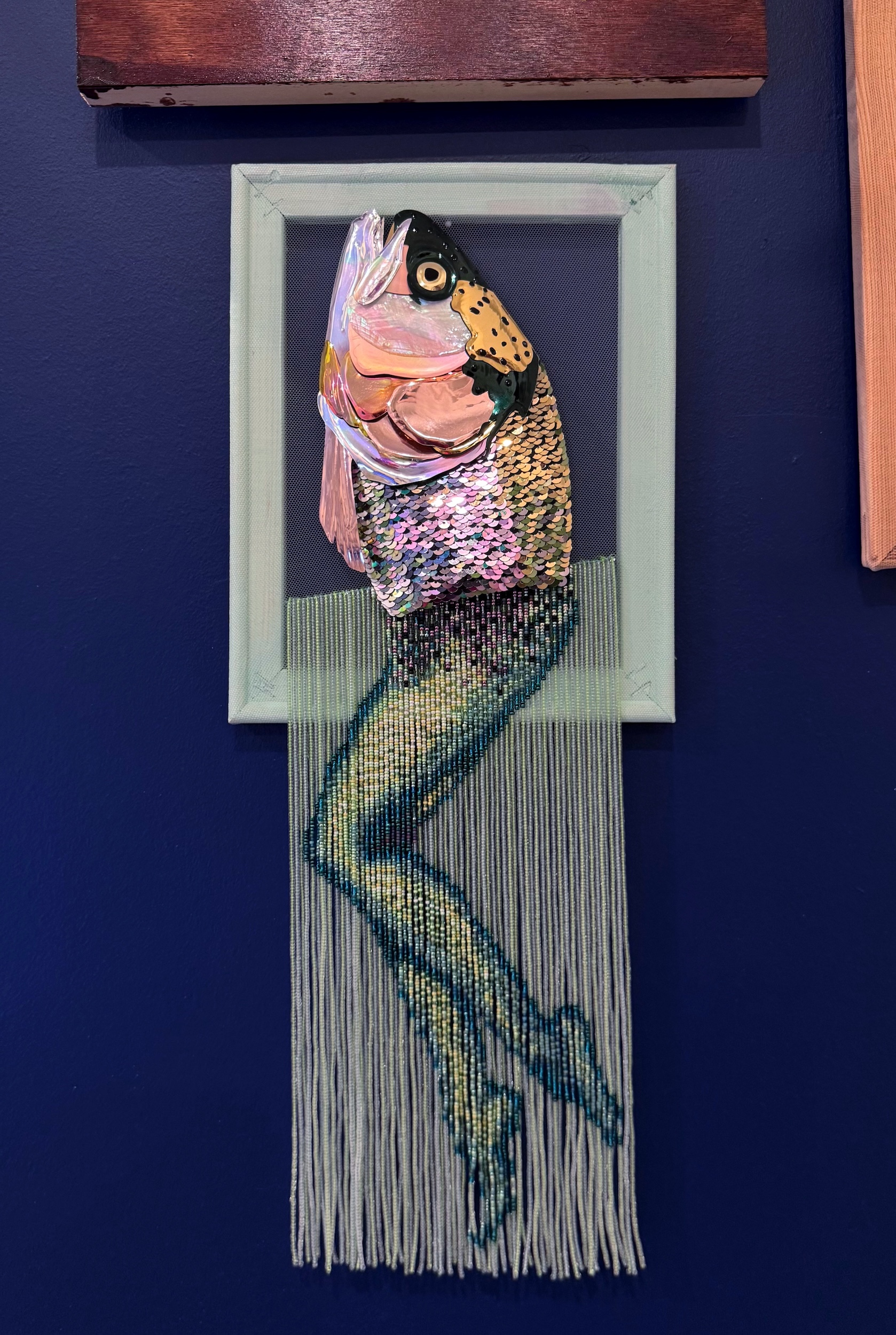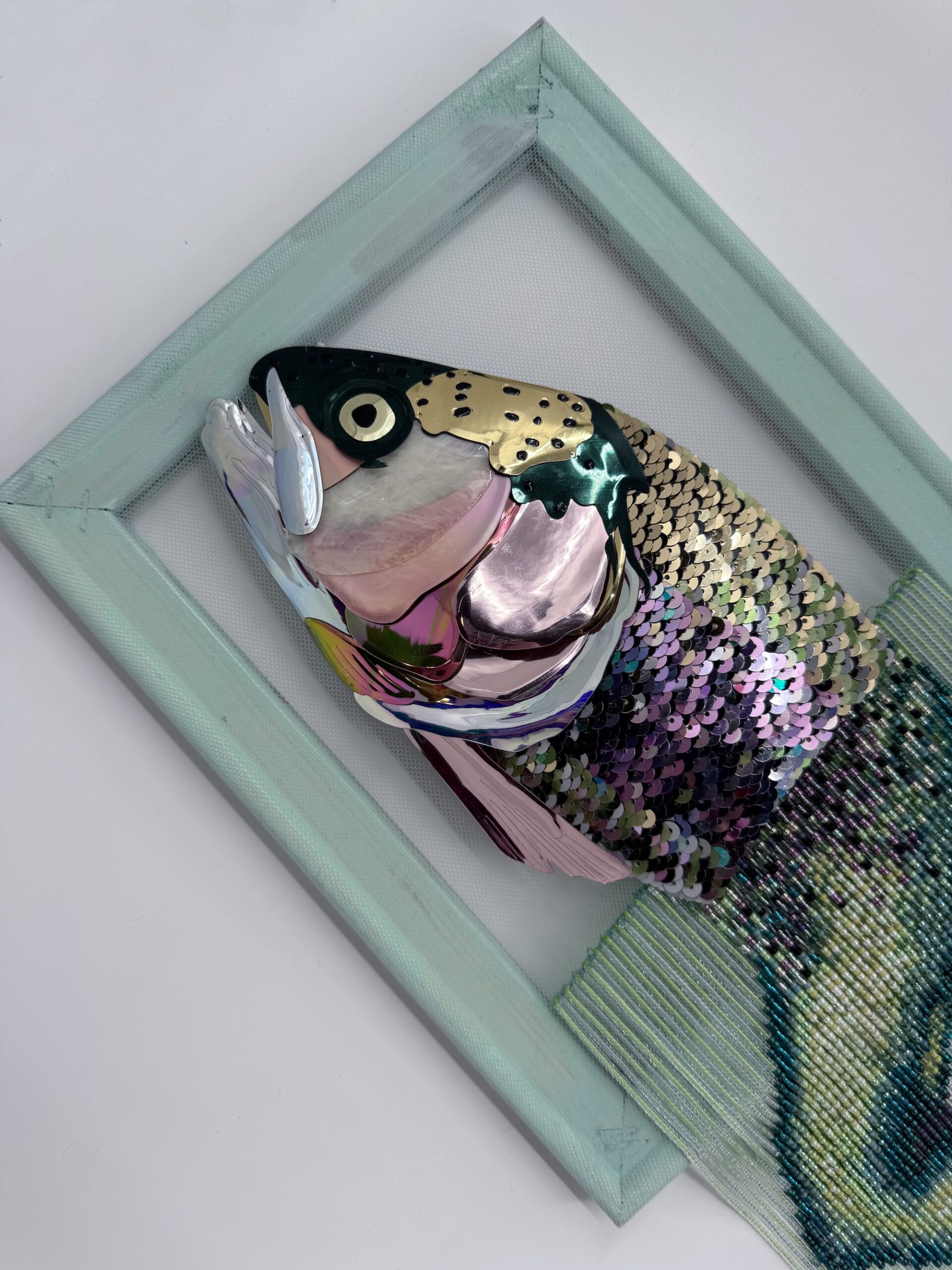 Sequin film, yupo, thread, felt illusion, pine frame with oak detail