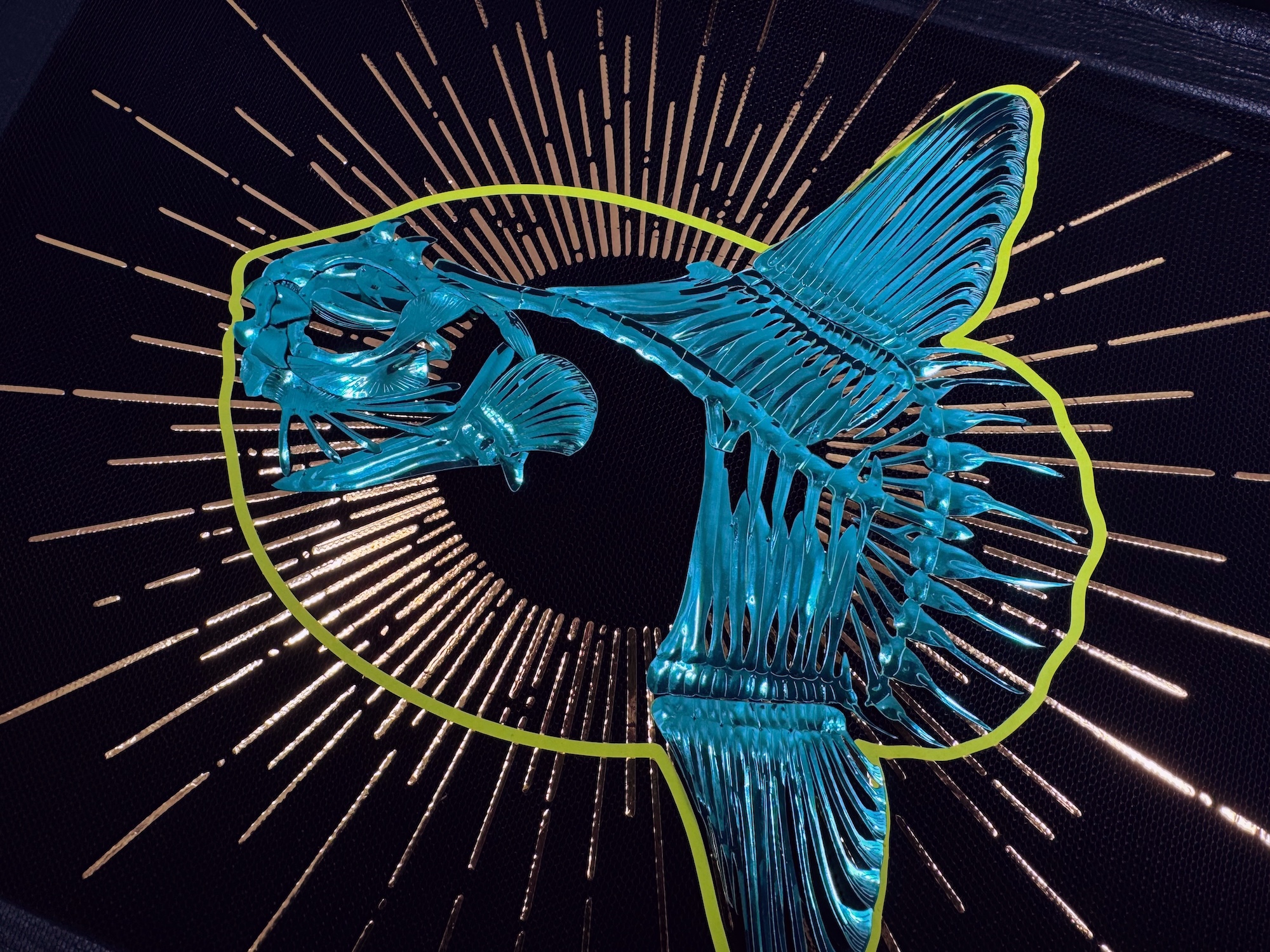 Materials: sequin film, thread, htv, acrylic paint, illusion fabric