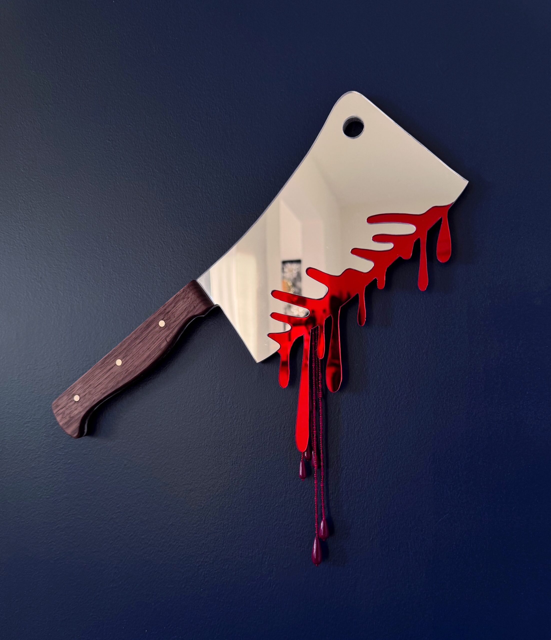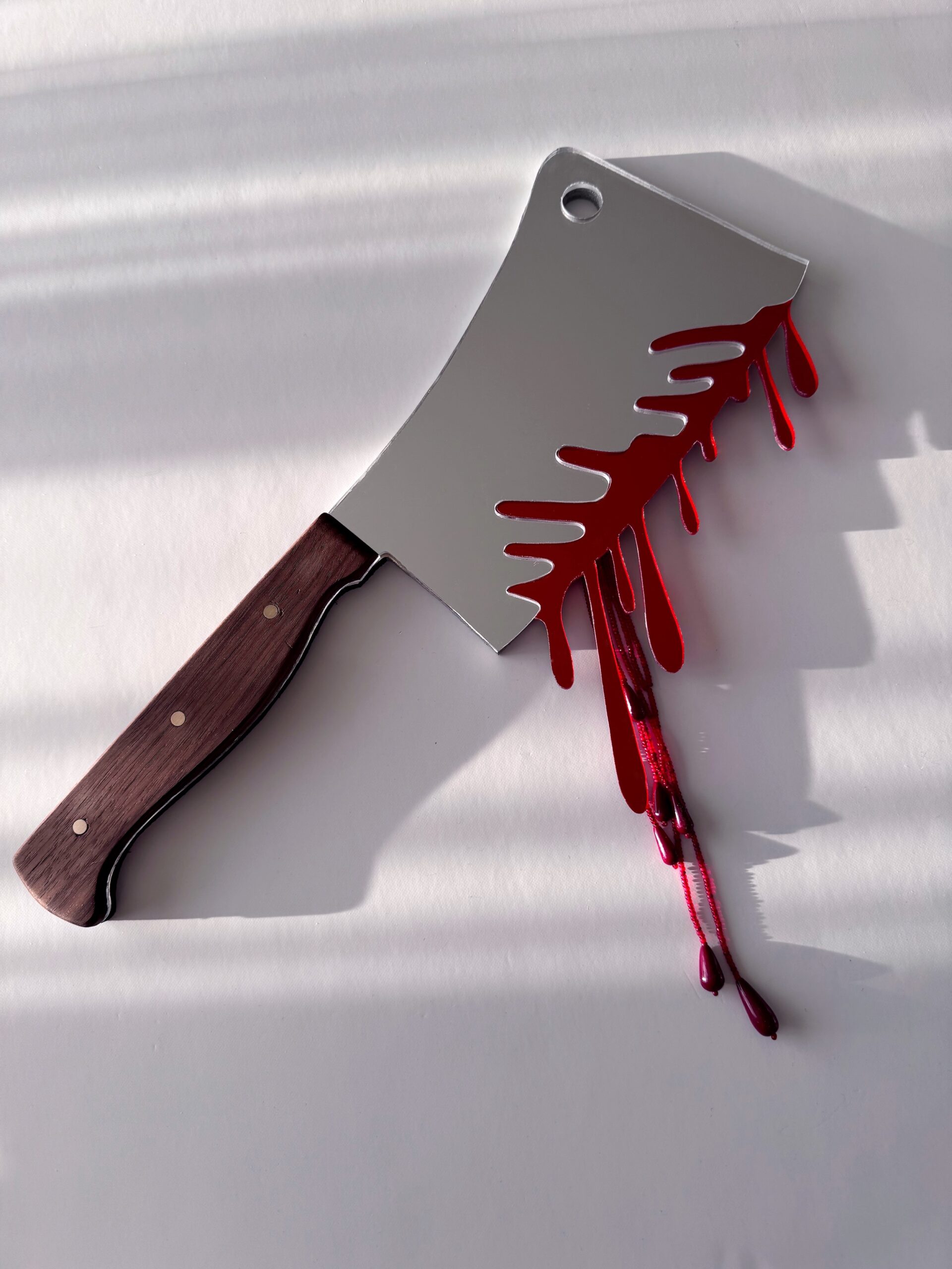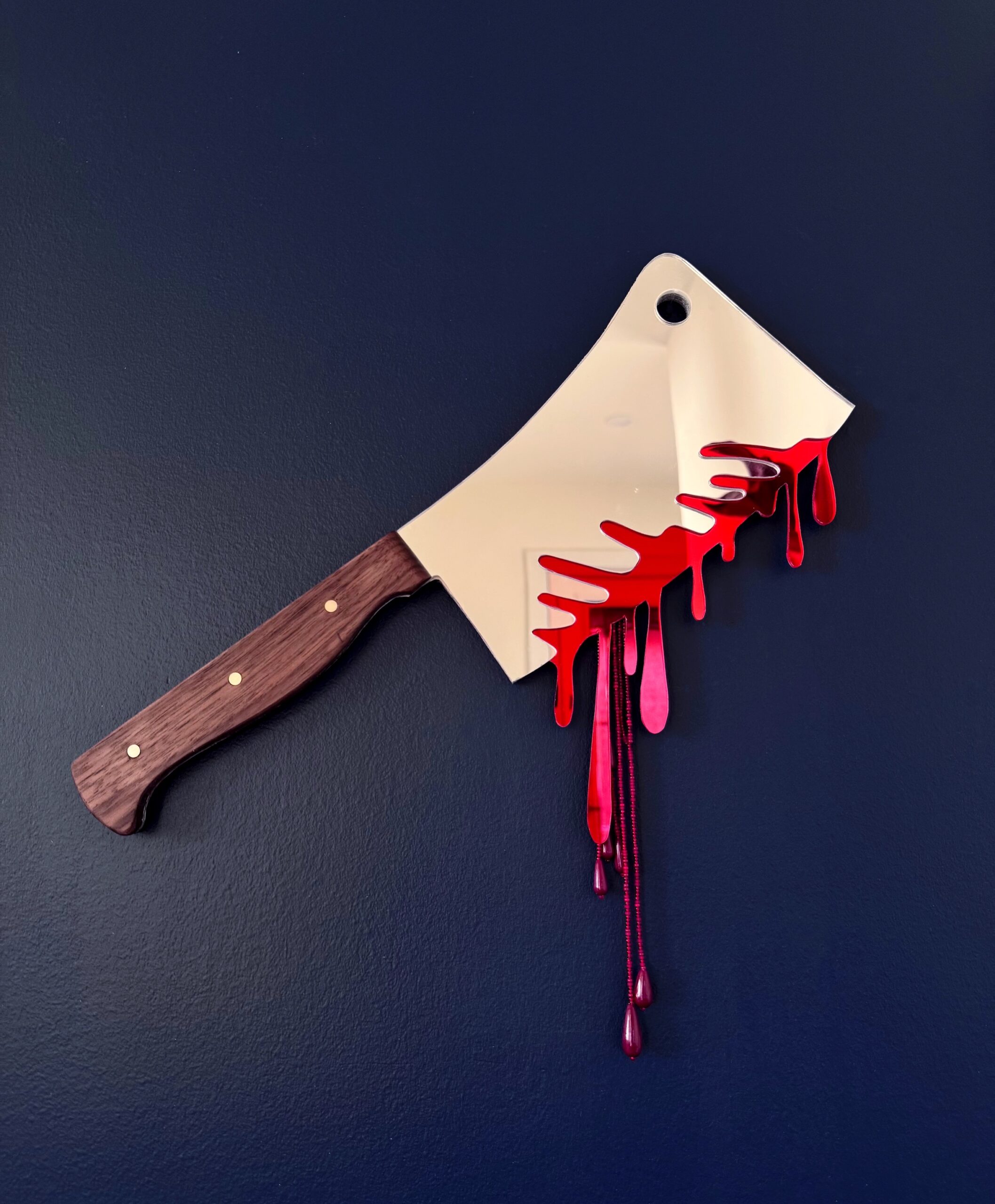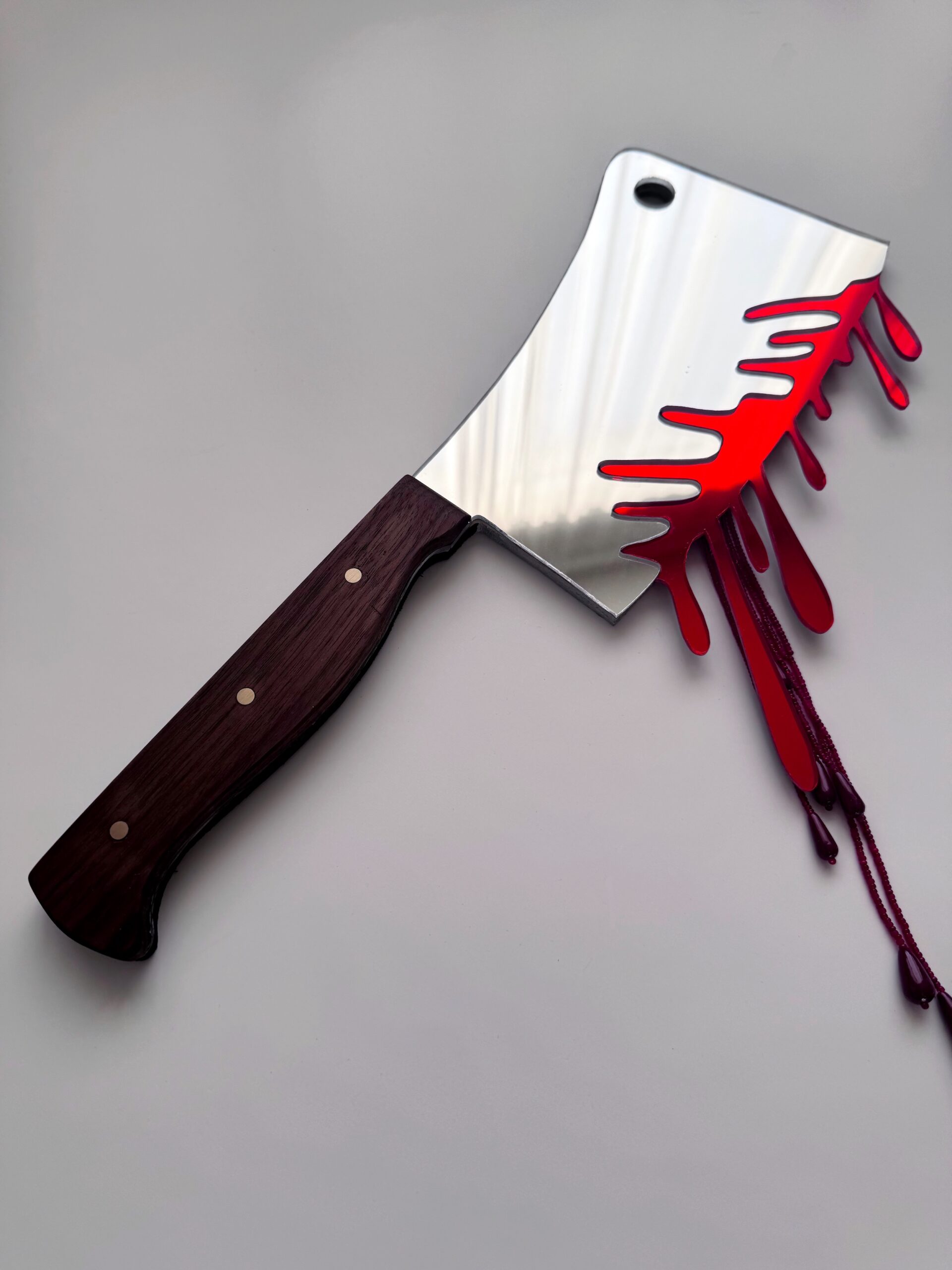 14″ long. The blade is 7.5″ long and 5″ wide. Including the blood drips – both beaded and acrylic – the height of the piece hanging at the right angle is 13.5″