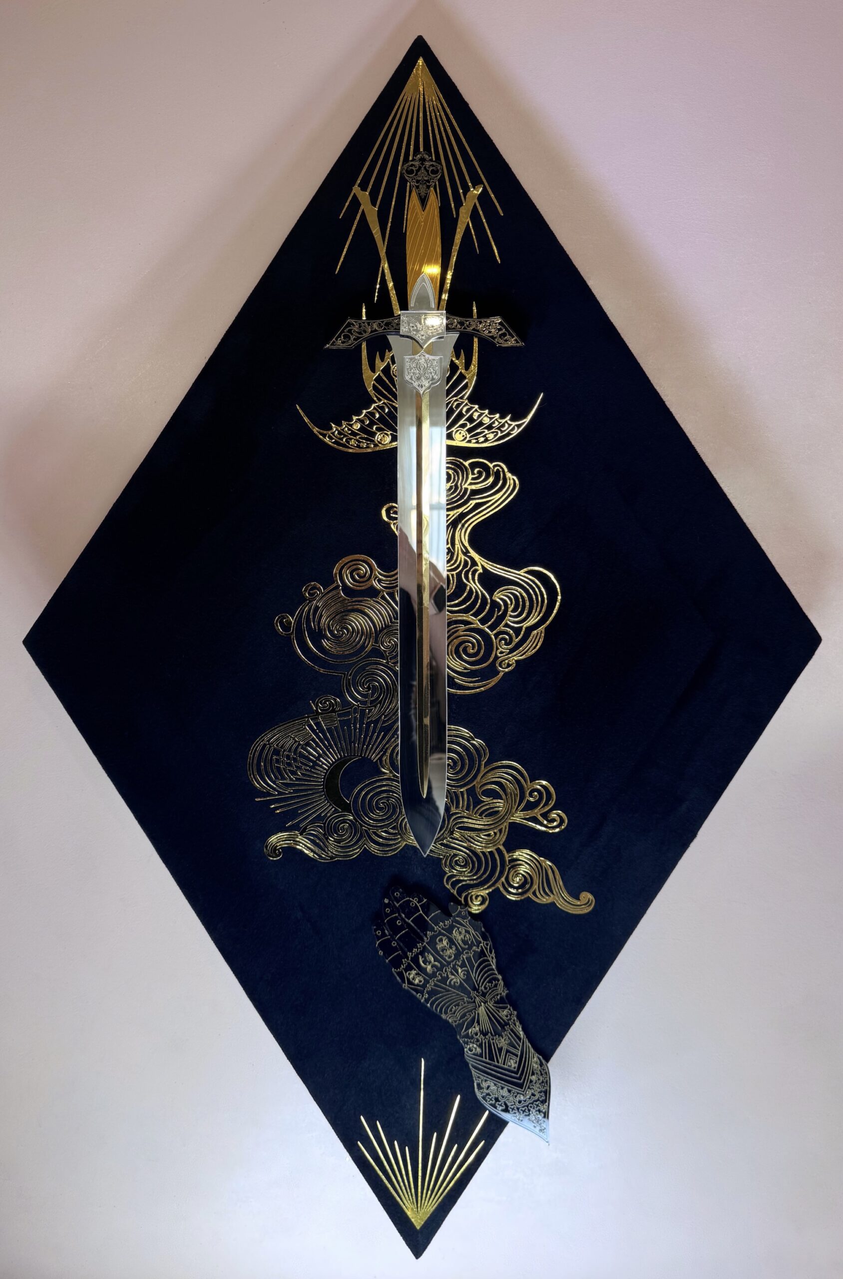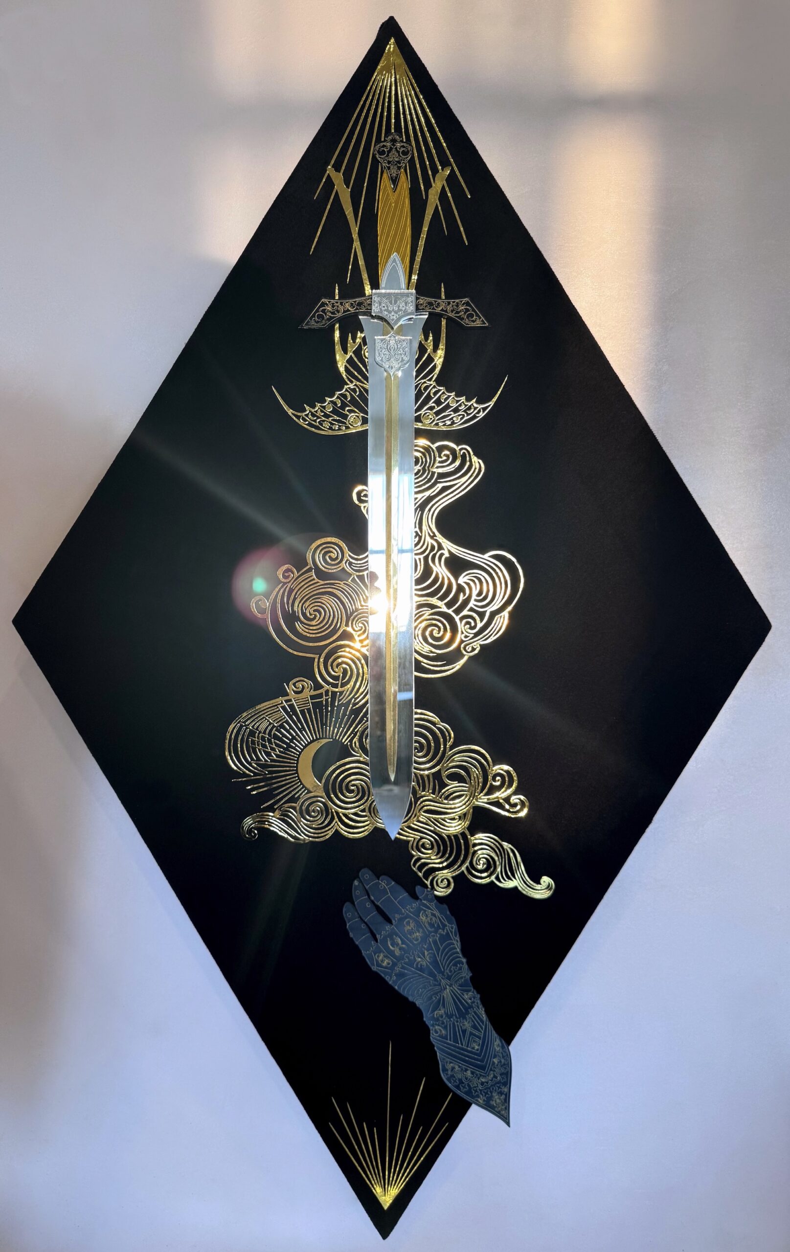 Sequin film, acetate, acrylic paint, thread, illusion fabric, pine frame with oak detail